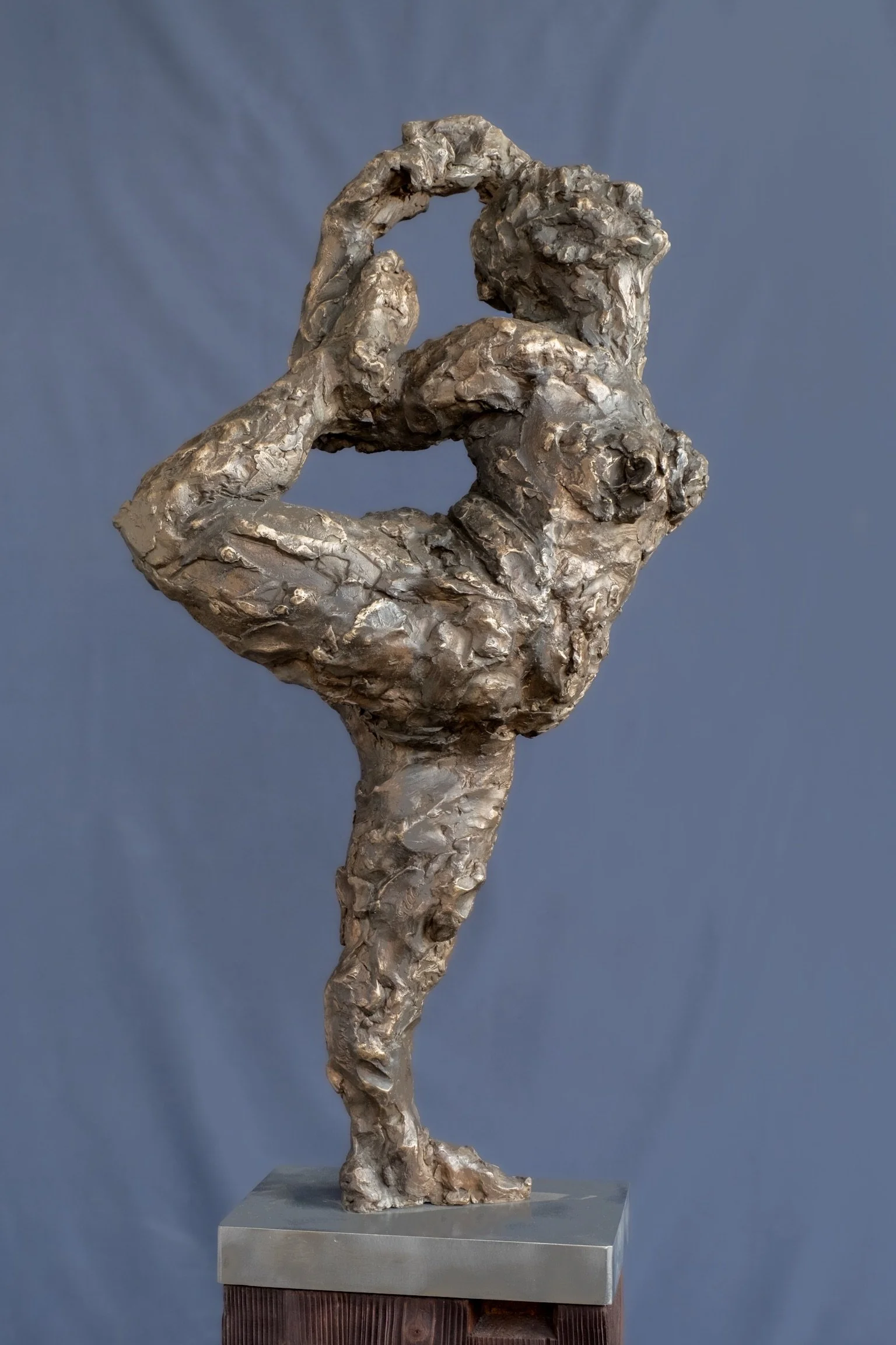 The background, sanded and textured, becomes part of the story, evoking skin, roots, or shifting air.